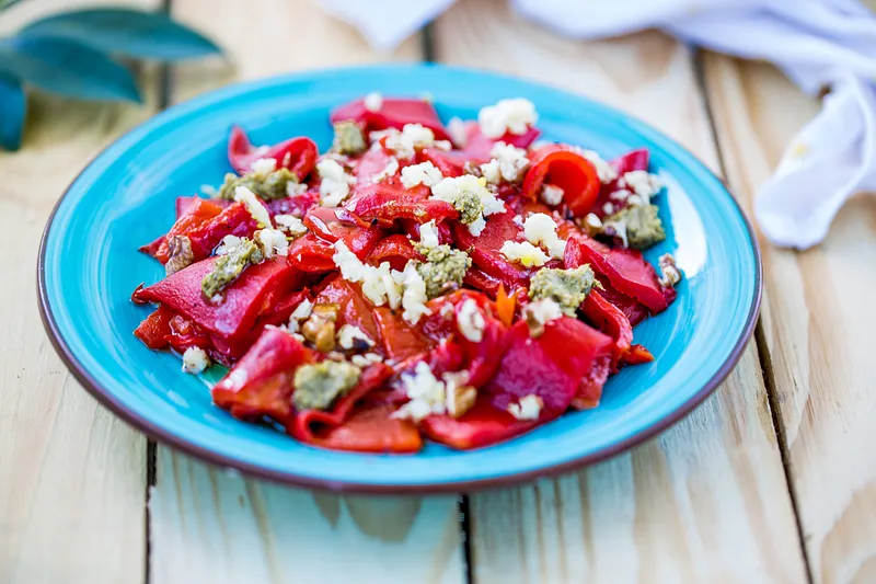 Печен червен пипер с орехи и песто