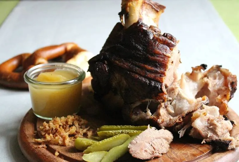 Естествено и традиционното за немската кухня сервиране: кнедли, кисело зеле, цвекло, ябълков мус, горчица, пържен лук, бретцели, земели, кисели краставички.