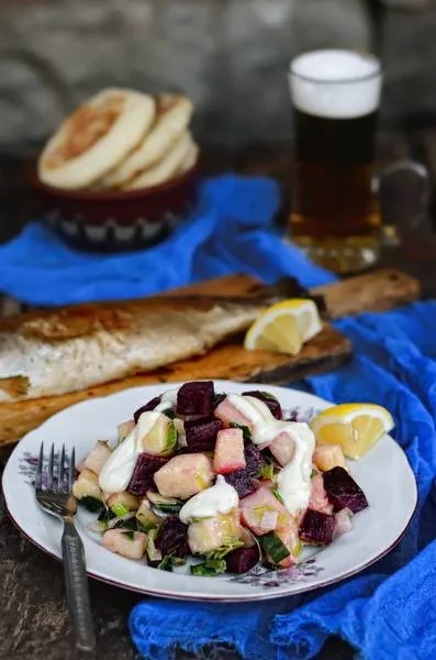 Печена пъстърва с лимонов сок и картофена салата