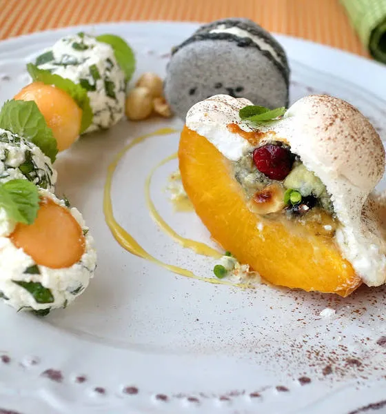 Запечени праскови с меки сирена е доказана и очаквано добра комбинация, а в случая пълнежът е обогатен и покрит с белтъчна глазура