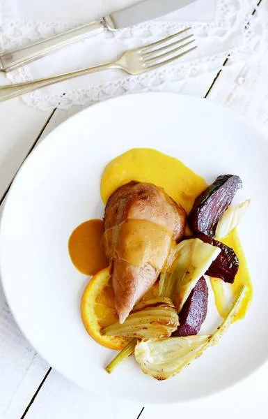 Печени пуешки бутчета с портокалов сок и гарнитура от печено червено цвекло и резене
