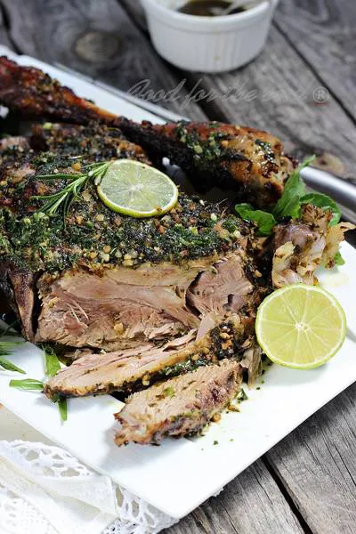 Печено агнешко бутче с билки и ментово песто с див чесън