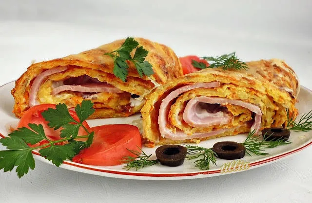 Печено картофено руло с шунка и топено сирене