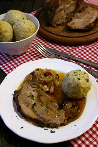 Печено свинско месо с кнедли, сос и кисело зеле с бекон
