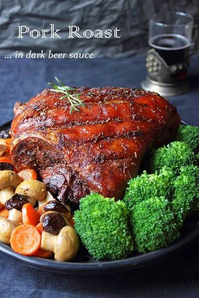 - Печем на долна скара в предварително загрята до 180С фурна около 2 часа, като след първия час поливаме със соса от печенето и доливаме с тъмна бира и вода в съотношение 2 към 1 (200 мл вода + 100 мл бира), ако е необходимо.