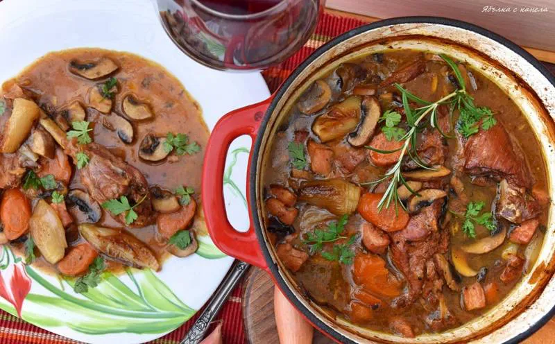 - 2-3 чаени чаши добро червено вино (burgundy, côtes du rhône, или pinot noir)