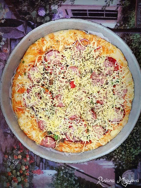 Пица от бирено тесто с домати, червен лук, наденица и кашкавал