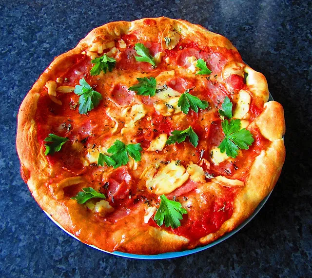 Това е пица, приготвена изцяло с продукти, които са присъщи за италианската кухня. Единствено магданозът не е на място, но пък е само за украса.