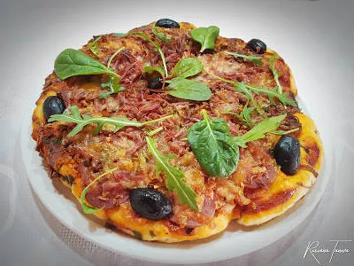Пица със салам, шунка, кашкавал и спанак