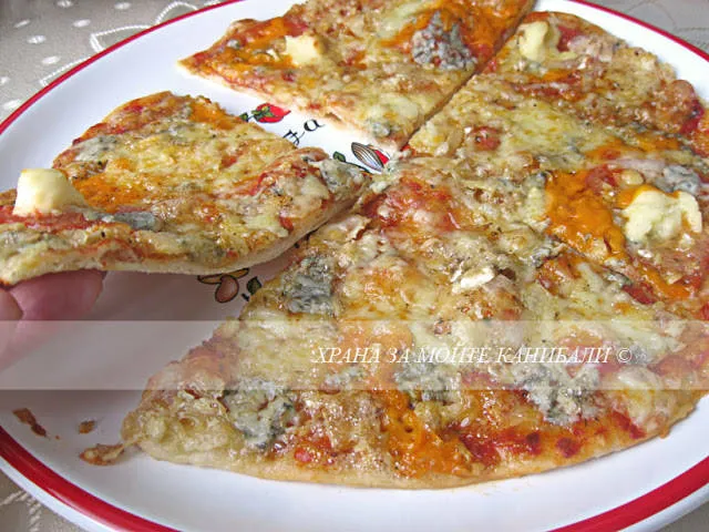 - чинията за пица с червения ръб: чедър, бри, синьо сирене, скаморца, кашкавал, няколко резена домат