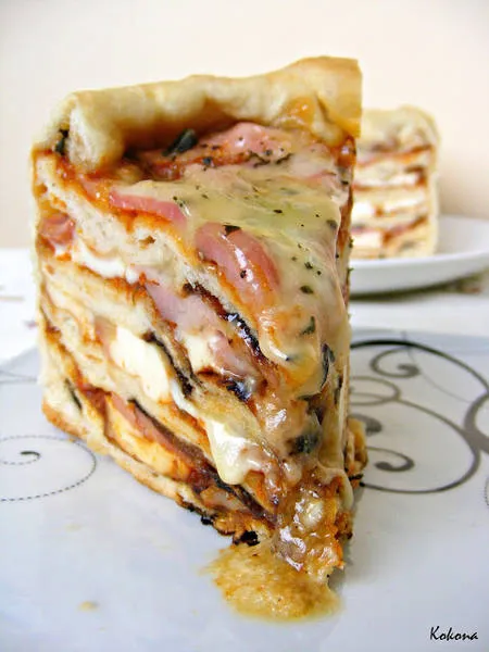Уверявам ви, не отнема много време за направа на пицата, а с нея може да изненадате както семейството си, така и гости :) На тази Pizza Cake ѝ се каня отдавна, но съвсем скоро беше първият ми опит да я направя, като тогава опита си отчитам като неуспешен и няма да показвам снимки, макар да бях натруфила много пицата торта и да се получи една висока и хубава торта, а при разрез спадна и се сплеска доста. Като грешка отчитам, че направих пицата подреждайки я с блатове от сурово тесто, като се надявах то да се изпече заедно с плънката. Все пак съм правила хлябове с пълнеж и винаги са се изпичали, да ама, бях сложила много сос, домати, пицата торта беше доста висока и явно това попречи на пицата да се изпече както трябва, или по-точно трябваше да пека малко по-дълго пицата, отколкото я пекох. Идеята видях тук: Pizza Cake - Step By Step За втория си опит изпекох предварително вътрешните блатове за пица. Не във фурната, а направо в тигана, като пърленки, за по 2 мин на блат. Тестото е разкошно, блатовете се разточват тънко и се пекат за отрицателно време, около 1 мин от всяка страна. Оставят се да изстинат и така се подрежда пицата.