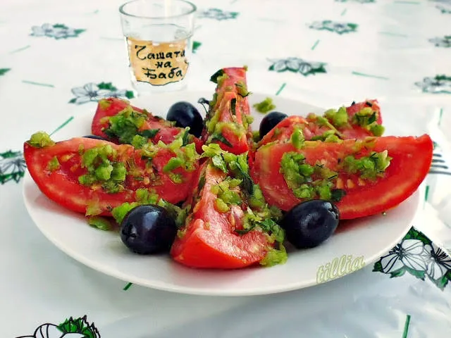Пикантна, ароматна салата, с интересна заливка, лесна за приготвяне. Ценността на рецептата е не само във вкуса, а и в това, че може да се приготви по-рано и да се поднесе в подходящия момент.