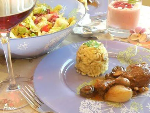 Днешното меню е салата Айсберг с чери домати, орехи и стафиди с портокалово-меден дресинг, основно блюдо - пиле Coq au vin с гъби и лукчета с гарнитура ориз с гъби и ягодов крем за десерт. Подходящо вино за това ястие е червено Бургундско или Pinot Noir.