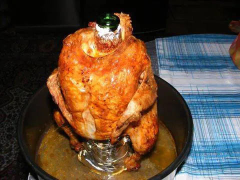 - Изпива се 1чч от бирата и се нанизва върху бутилката овкусеното със сол и подправки пиленце+ червен пипер.