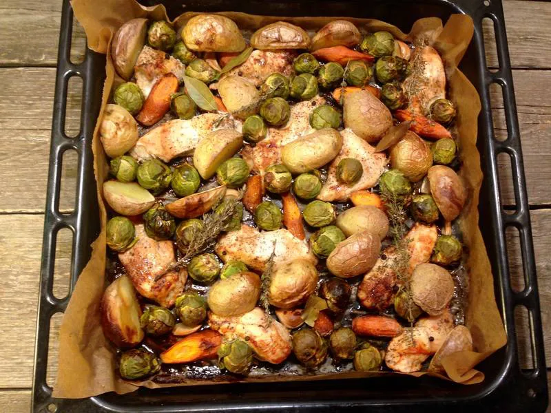 Пиле с пресни картофи, моркови и брюкселско зеле