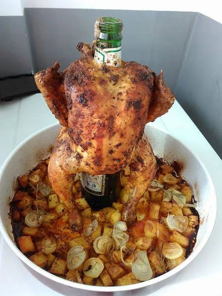 Пиле с розмарин и бира върху бутилка