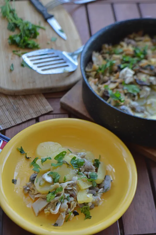 Сочно Пилешко, запечено с Пресни Гъби и Картофи