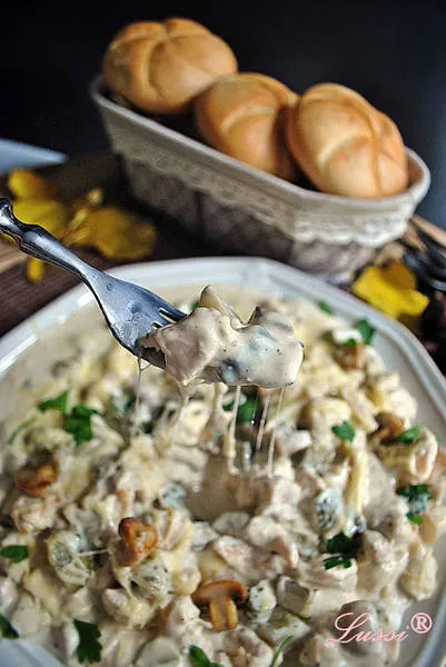 Комбинацията на крехко, сочно пилешко месо, окъпано в богат кремообразен сос от сметана и топено сирене, гарнирано с ароматни гъбки и хрупкави кисели краставички е неустоима