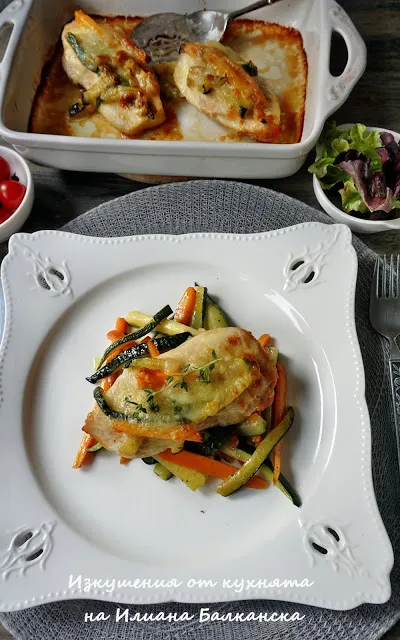 Пилешки гърди със сотирани зеленчуци и моцарела