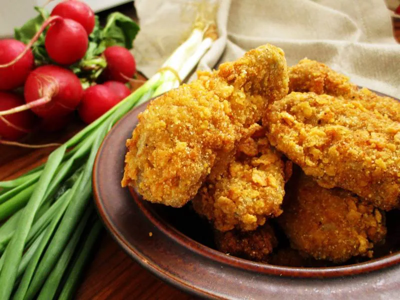 - Разбийте яйцата, натрошете или смелете корнфлейкса. Потопете всяко парче месо в яйцето и оваляйте в корнфлейкса. Наредете готовите крилца на поднос и ги оставете за 30мин. Обърнете ги веднъж и от другата страна. Защо се прави това? Яйцето, в което са потопени късчетата засъхва, стяга и панировката прилепва добре. Така по-малко от нея ще изпадне при пърженето, мазнината ще остане чиста и няма да загори.