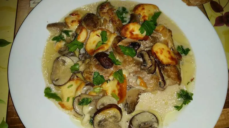 Крехко пилешко месо, ароматни гъби, неустоимо сиренце и сосче в което да топнем залък :)