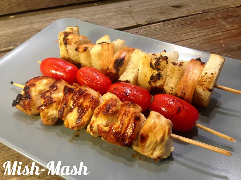 Изключително вкусни шишчета с пилешко месо, чери домати и кубчета хляб, които могат да бъдат приготвени както на барбекю, като и на оребрен тиган. Маринатата е разкошна и придава на продуктите много свежест и аромат.