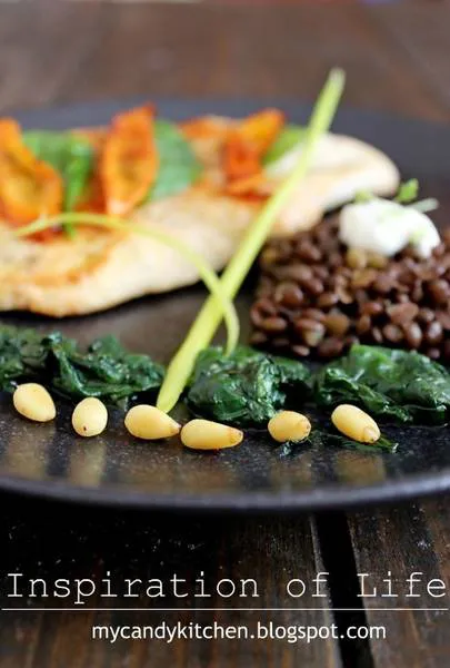 Пилешкото филе се сервира с чипс от моркови, леща Белуга, йогурт, задушен спанак и кедрови ядки