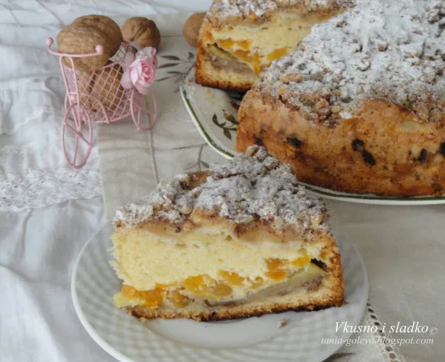 Богат,ароматен сладкиш,подходящ за делник и празник с три вида пълнеж- ябълков, сушени нарязани кайсии ,накиснати в коняк и обилна орехово-захарна -канелена поръска