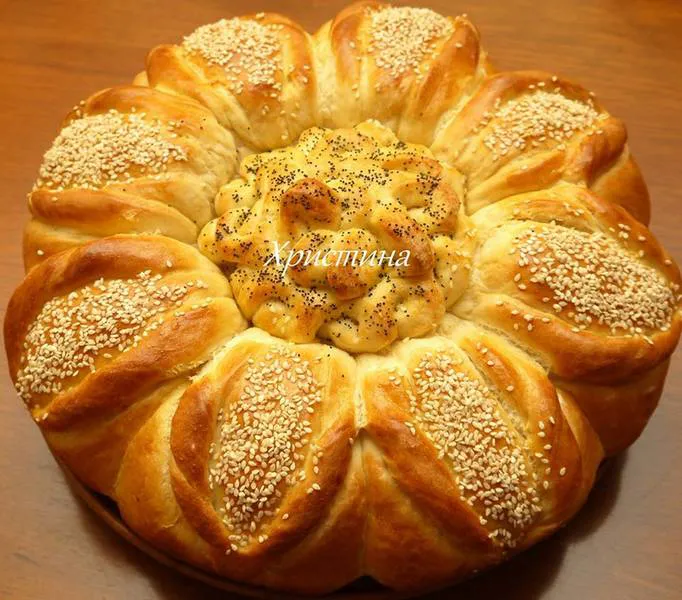 - Едната част от 200 г тесто се разточва на кръг с диаметър около 28 сантиметра. Разделя се на 8 сектора. На всеки сектор в средата се прави прорез и върхът на триъгълника се промушва два пъти през прореза. В широката част на триъгълника се поставя една от топките и върху нея се поставя усуканата част.