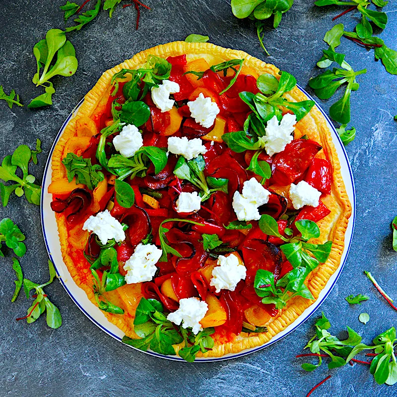 Вместо познатото тесто за пица, използвам небесно леко, люспесто-хрупкаво бутер тесто. Не използвам сос, а директно покривам повърхността на пицата със запържени червени и жълти камби, зелени аспержи и вкусен колбас Чоризо, козе сирене и зелена салата.