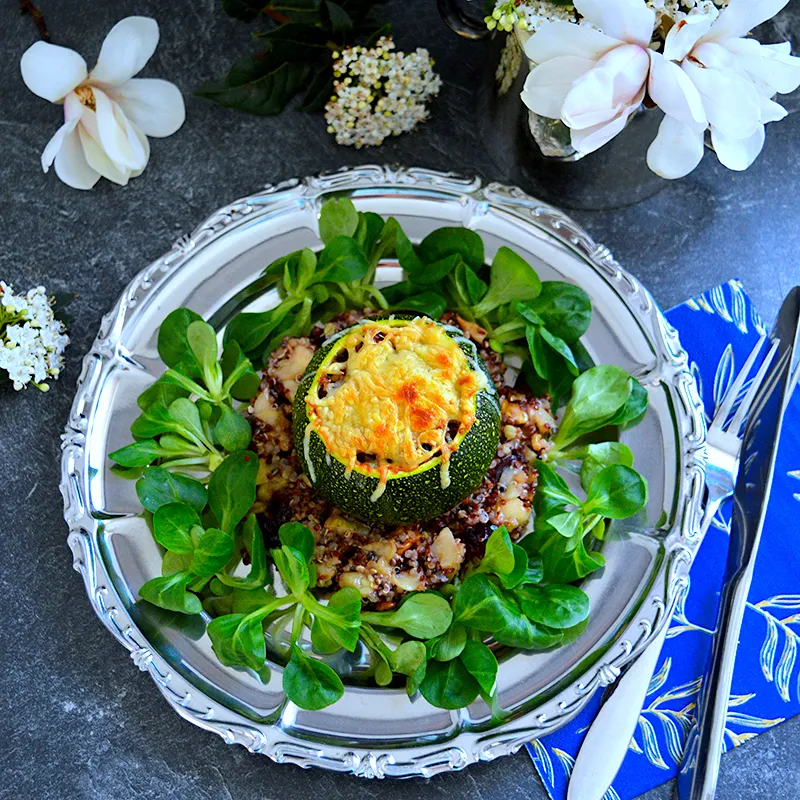 Кръгли тиквички пълнени с киноа, орехи и сухи червени боровинки с божествен аромат от канела и индийско орехче.
