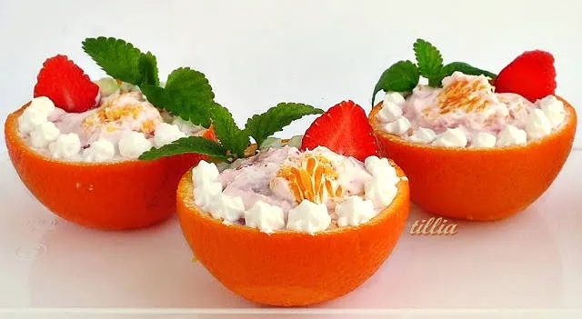 Много приятен десерт, вкусно съчетание на портокали, ягоди и сметана и ефектно поднесен!
