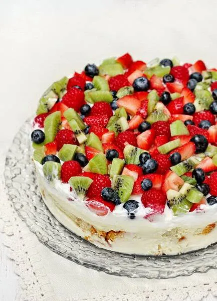 - около 3-4 ч.ч пресни плодове за гарниране – ягоди, малини, боровинки, киви, кайсии, праскови, ананас...