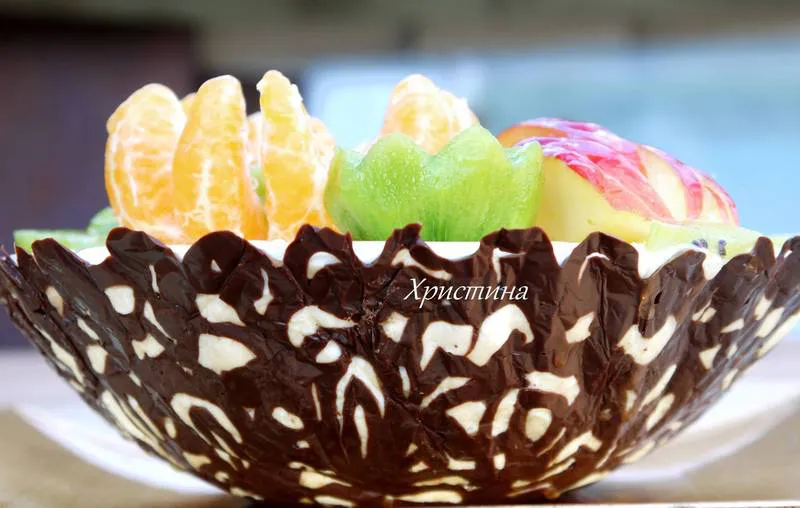 Шоколад, сметанов крем, плодове приготвени в шоколадова купа