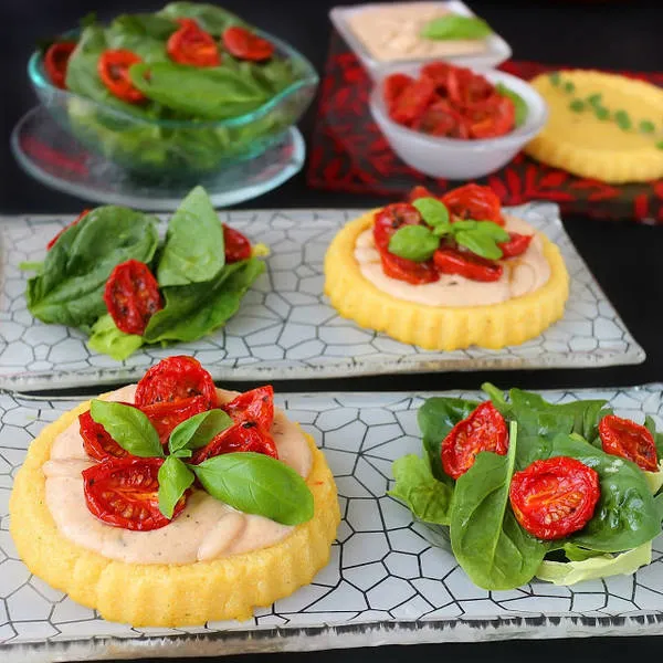 Полента с киноа върху пикантен сос и пюре от бял боб