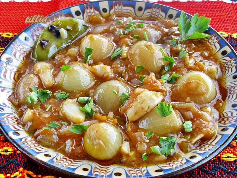 Вкусно българско ястие. За съжаление вече не се готви така често, главно заради известната трудност при почистването на лукчетата.