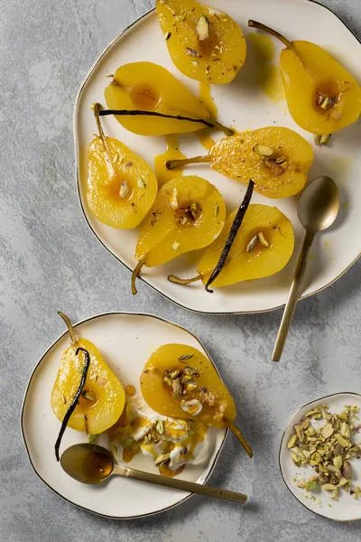 Поширани круши в сладко вино с шафран и ванилия