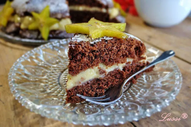 Чудесно предложение и за тези от вас, които или постят или са станали вегани. Популярна луда торта, която е без мляко, яйца и масло, но този път реших да я обогатя с един пласт вкусен крем ванилия, направен със соево мляко