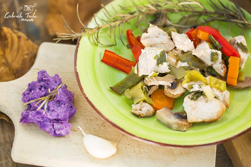 Пуешка кавърма с пюре от лилави картофи