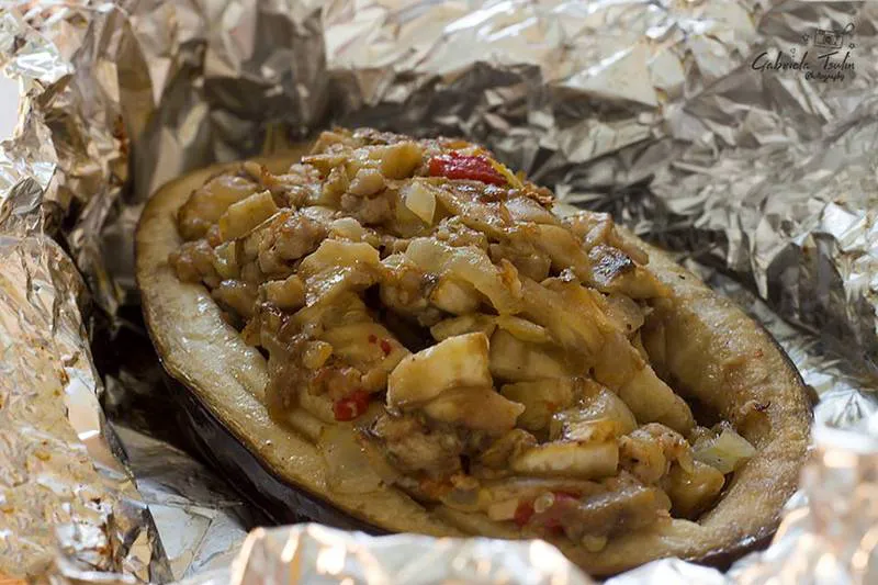 Пълнен патладжан с кайма и кашкавал, върху канапе от зеленчуци
