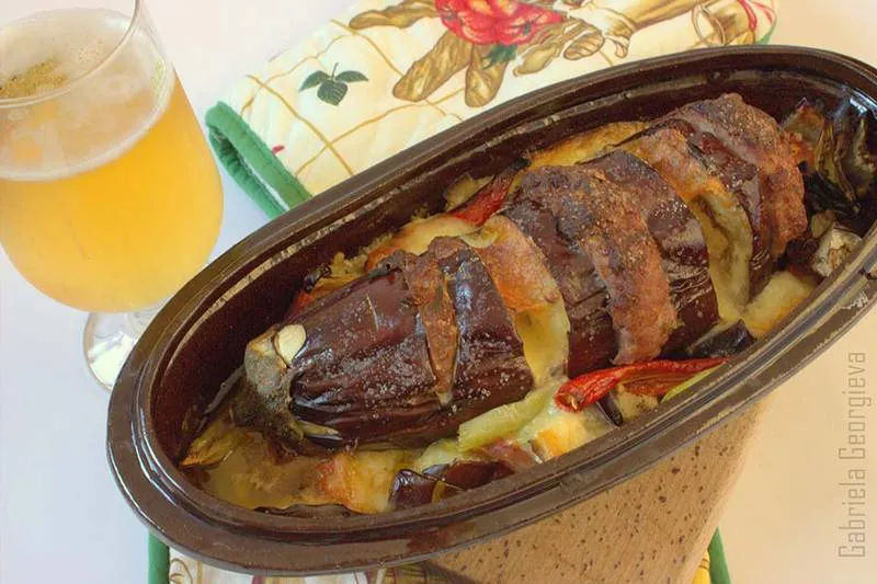 Пълнен патладжан с кайма и кашкавал, върху канапе от зеленчуци