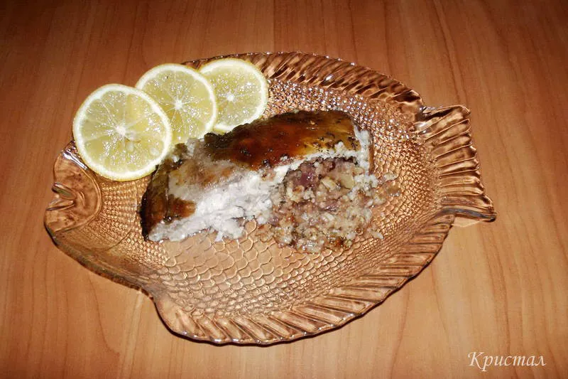 Поливаме шарана с лимонов сок преди пълнене и оставяме да отлежи. Плънката е с червен лук, орехи и ориз.