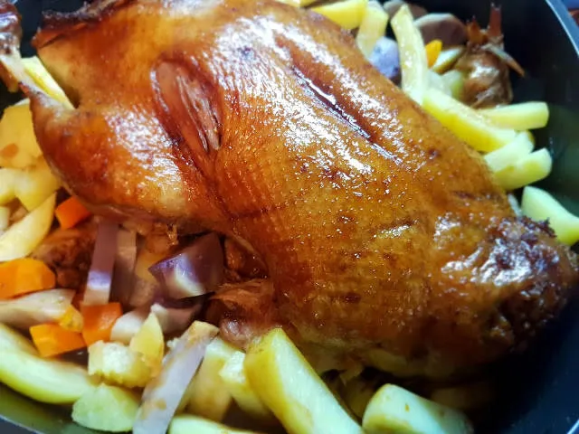 - 1 патица, шарен пипер, сол, соев сос кикоман с чесън, горчица, кленов сироп, лимонов сок.