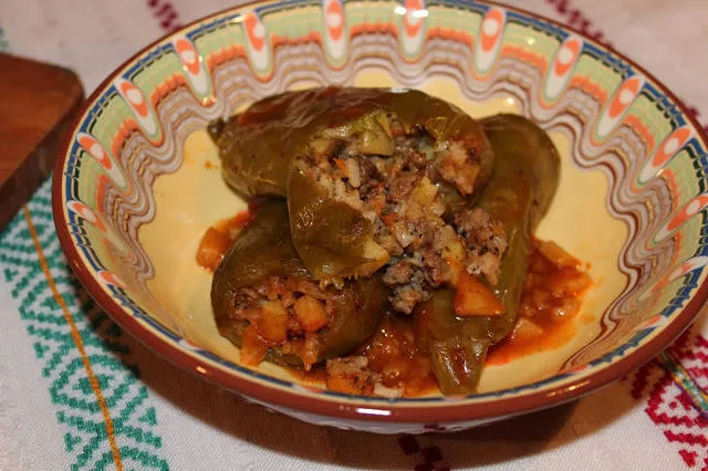 Пълнени чушки с картофи, кайма и ориз