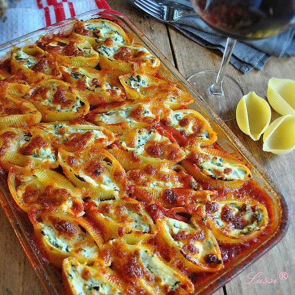 Пълнени макаронени черупки с кремообразен пълнеж от рикота и спанак, окъпани в горещ, ароматен доматен сос, а най-отгоре - нежна коричка от запечена леко хрупкава моцарела, с разтеглива сърцевина.