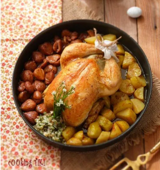 Поднесете пълненото пиле в поднос, нарязано на порции, гарнитурите (включително пълнежа) около него.