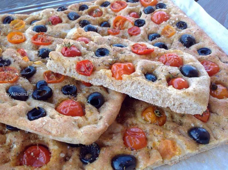 Пълнозърнеста фокача с домати, маслини и риган
