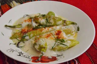 Пържени люти чушлета с млечно чеснов сос