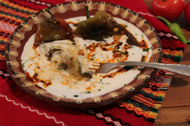 Пържени печени чушки със сос от кисело мляко и сирене