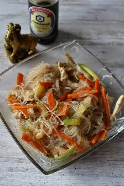 Пържени спагети с пилешко и зеленчуци по китайски